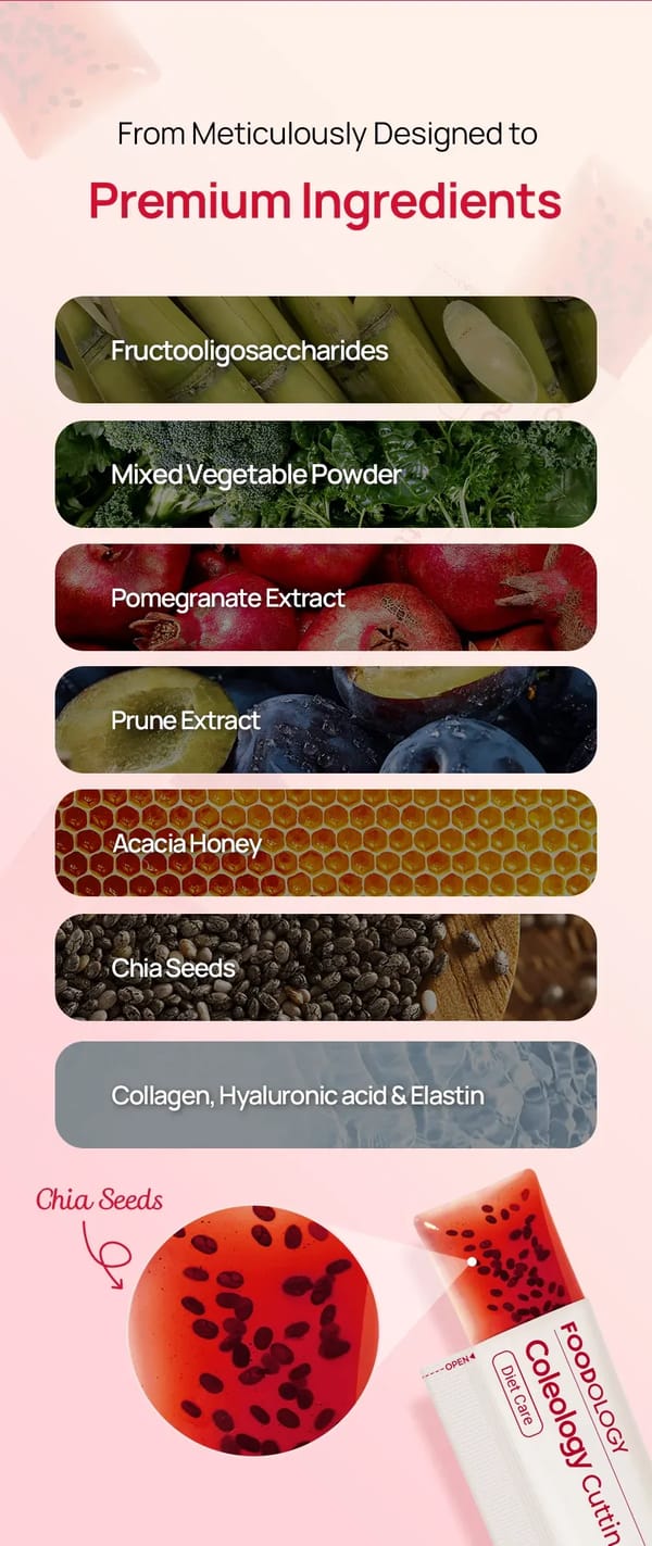 Indigestive Maltodextrin, Garcinia cambogia extract, Purified water, Pomegranate concentrate, Fructooligosaccharide, Honey, Red grape concentrate, Chia seed, Locust Bean Gum mixed powder, Citric acid, European plum concentrate, Pomegranate flavor, Isomalto-oligosaccharide, Xylitol, D-Sorbitol, β-Cyclodextrin, Carmine mixed preparation, Vegetable mixed concentrate powder, Sucralose, Fish collagen, Milk protein, Hyaluronic acid mixed preparation, Elastin, Dry yeast, Vitamin C, Calcium Pantothenate